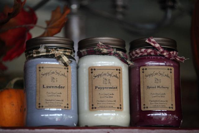Each candle is hand-poured into a square mason jar, and topped with a brown rustic lid. Kraft Paper labels add to their warm charm. Each candle is embellished with a hand-ripped and tied fabric ribbon.